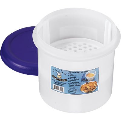 The best way to batter fish, shrimp, chicken, and vegetables before you fry! No mess to clean up. Will not leak batter. Simply place flour, bread crumbs or fish fry in the bottom of the Flip N Fry bowl, then place meat, fish or vegetables on top of the basket. Close the lid tightly, turn upside down and flip back and forth several times, then turn upright, shake lightly, remove top and your evenly coated items are ready to cook. 1 1/4-gallon container can batter up to nine 8in. fillets or 1 lb. shrimp at a time. Freezer and dishwasher safe. U.S.A.